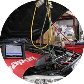 くるまやBumpy(バンピー)ではカーエアコン修理専門の設備が充実しています。各機能の作動チェックを行ったり、ガス漏れの確認、水圧テストなど徹底した故障探求を行います。